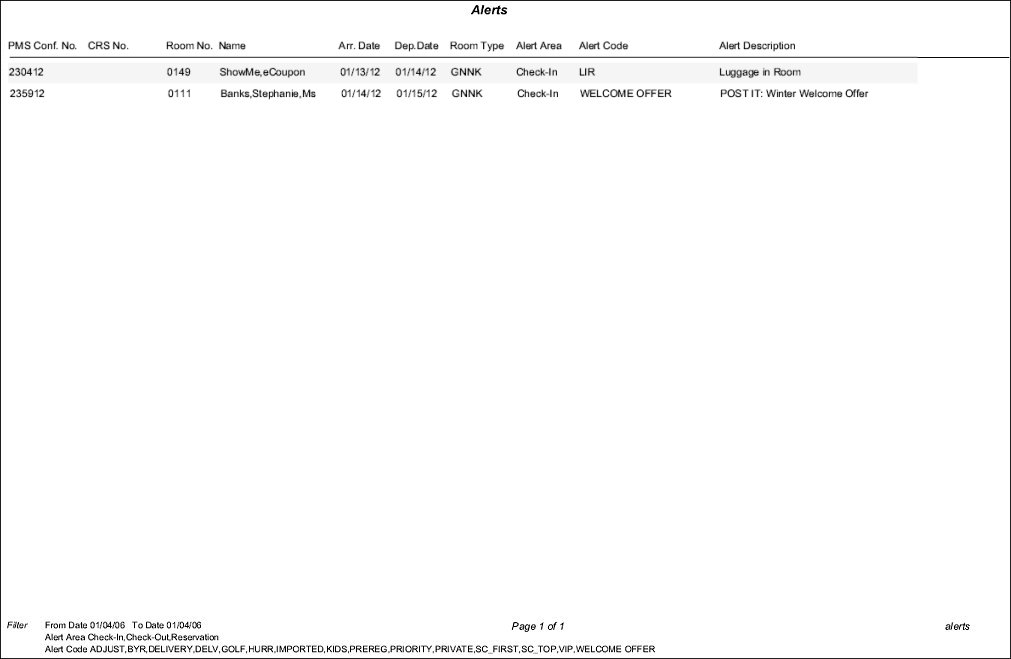 The Alerts report will display all reservations with an attached Alert that fall within the stay date range selected on the attached RES10.FMX. The Alert functionality is available when the RESERVATIONS > ALERTS application function is set to Y.