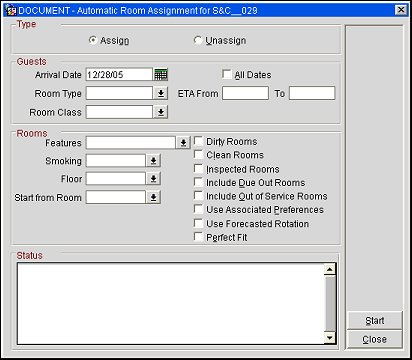 Use this screen to automatically assign room numbers to individual reservations or to your group reservations and PM. With the Room Assign function you can block all reservations for specific arrival dates, room types, room feature preferences, or smoking requests. Reservations for the block or group must have been made prior to using this option. Once Auto Room Assignment has been completed, the group check-in can be done.