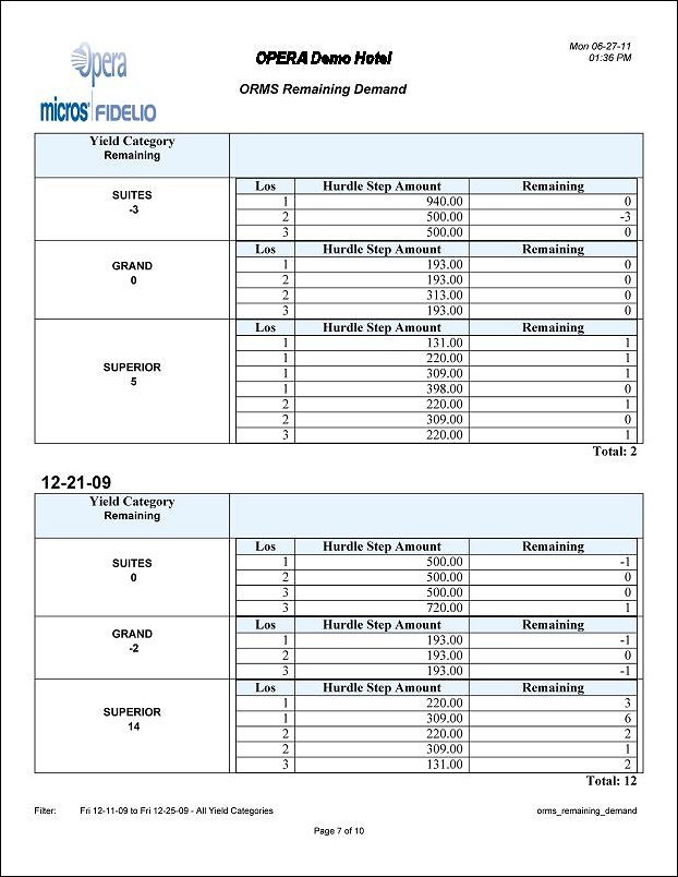 This report uses Full LOS Optimization. It displays the Length of Stay hurdles up to the Max. LOS for each Yield Category with Remaining demand forecasted per LOS and Hurdle Step Amount for arrivals.