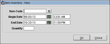 If Items is selected, the Item Inventory screen will open and a new item can be attached to the reservation. The RESERVATION screen will display the selected item in the item inventory field: